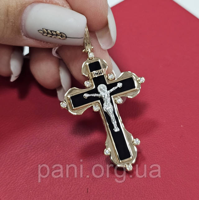 Відправка з 05 січня 2026Хрестик золотий з розп'яттям написом Спаси і Збережи біле та жовте золото з чорною емаллю і фіанітами