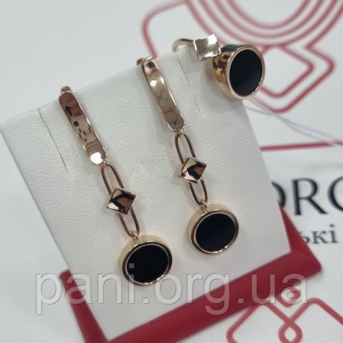 Комплект золотий каблучка та сережки підвіски з круглим чорним оніксом